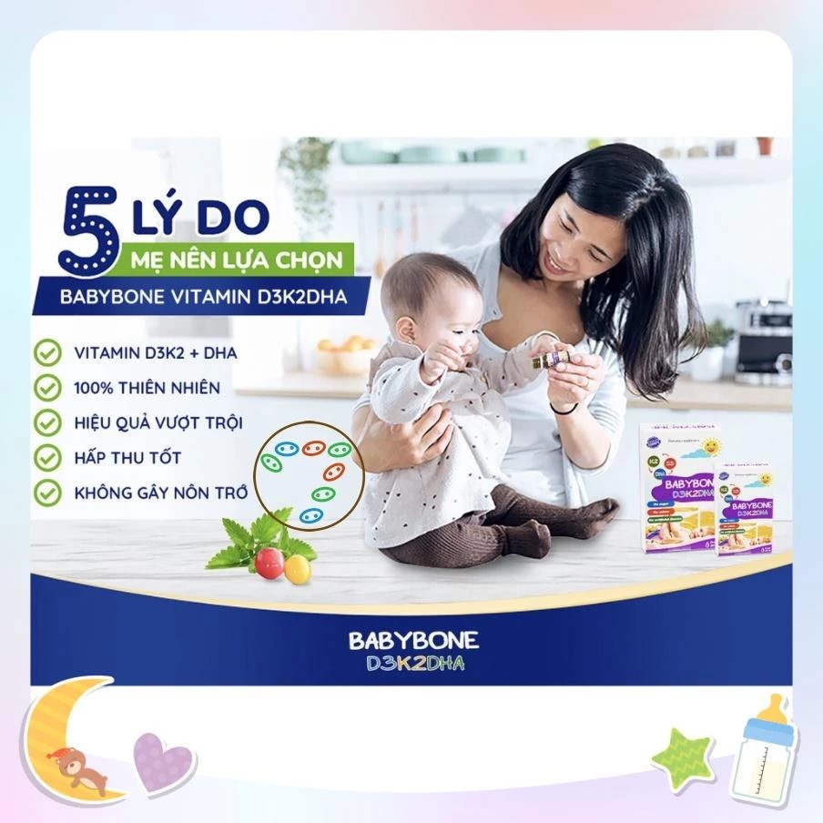 Mua tại TiktokThực phẩm bảo vệ sức khỏe Babybone D3K2DHA Xuất xứ: Tây Ban Nha Thành phần: Dầu Vitamin D3 1 000 000 IU/g : 0,4mg Trong đó Vitamin D3 (cholecalciferol): 400 IU (10 µg) Dầu Vitamin K2 MK-7 (menaquinone-7) 1 500 ppm : 15mg Trong đó Vitamin K2 MK-7 (menaquinone-7) : 22,5 µg Dầu cá chứa 80% DHA: 0,00625 mg Trong đó DHA 5 µg. Phụ liệu: Triglycerides chuỗi trung bình. Công dụng: Giúp bổ sung vitamin D3 và vitamin K2 MK-7 cho cơ thể. Hỗ trợ tăng cường hấp thu canxi. Đối tượng sử dụng: Trẻ em cần bổ sung vitamin D3 và vitamin K2 MK-7. Trẻ em đang trong giai đoạn phát triển. Chú ý: