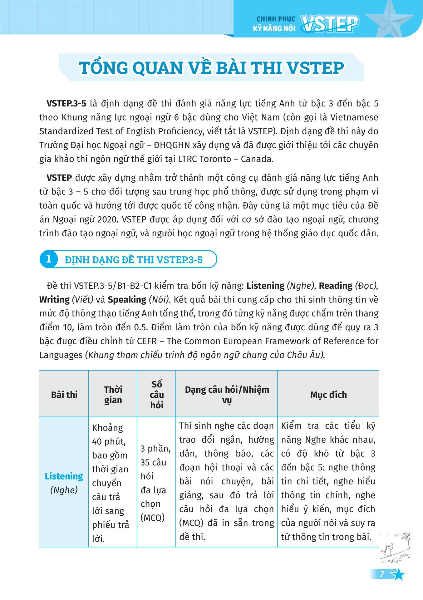 VSTEP - Chinh Phục Kỹ Năng Nói Bậc B1, B2+ Cuốn sách được chia thành 10 bài học, mỗi bài học tập trung vào 1 chủ đề người học thường gặp trong kì thi VSTEP.