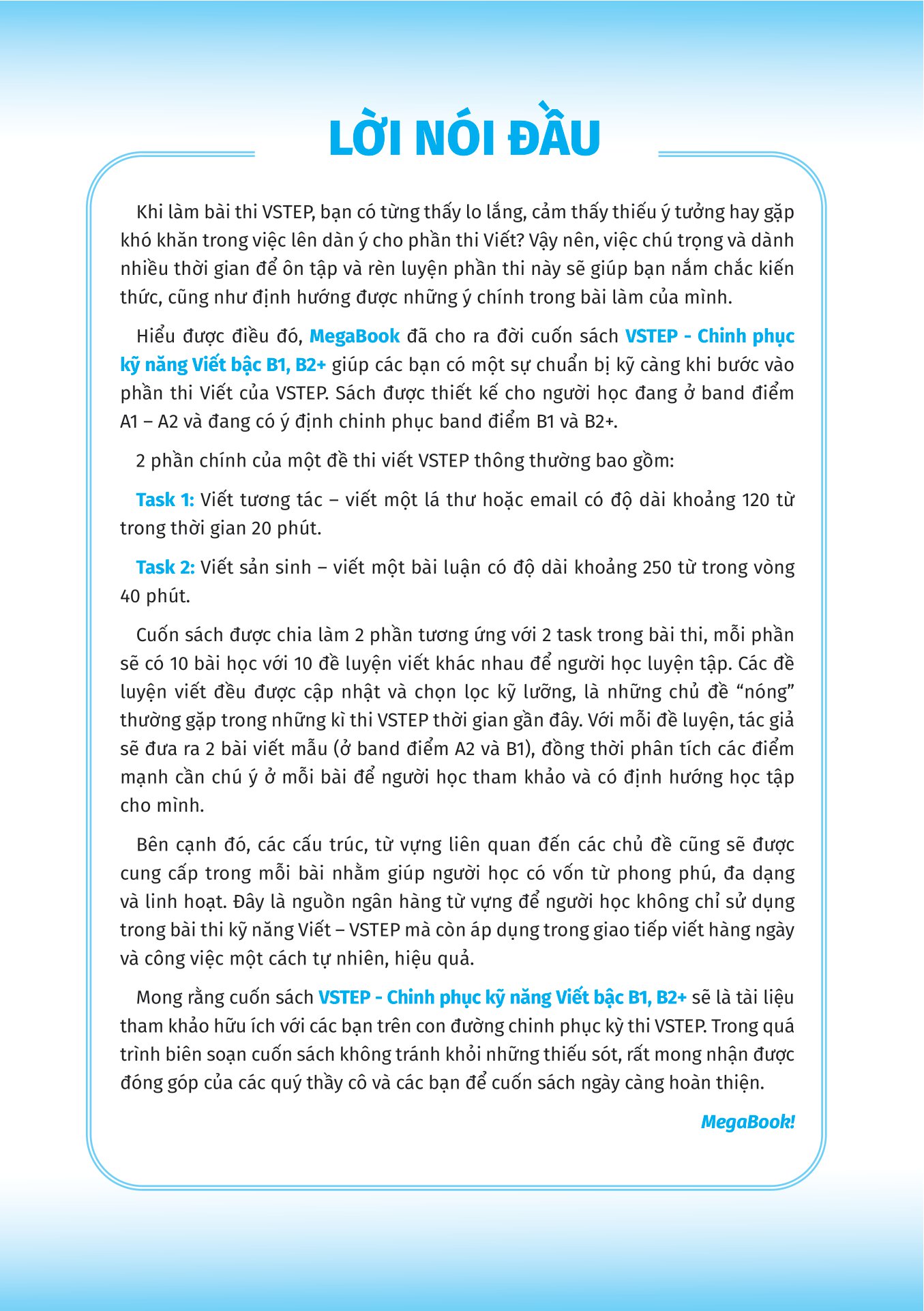 Mua tại TiktokThông tin sản phẩm Mã hàng 8936214272006 Tên Nhà Cung Cấp Megabook Tác giả Lưu Ngọc Nam NXB Đại Học Quốc Gia Hà Nội Năm XB 2023 Ngôn Ngữ Tiếng Việt Trọng lượng (gr) 230 Kích Thước Bao Bì 24 x 17 x 1 cm Số trang 216 Hình thức Bìa Mềm VSTEP - Chinh Phục Kỹ Năng Viết Bậc B1, B2+ Sách được chia làm 2 phần chính của một đề thi viết VSTEP thông thường bao gồm: Task 1: Viết tương tác – viết một lá thư hoặc email có độ dài khoảng 120 từ trong thời gian 20 phút. Task 2: Viết sản sinh – viết một bài luận có độ dài khoảng 250 từ trong vòng 40 phút. Ưu điểm của cuốn sách VSTEP - Chinh phục kỹ năng Viết bậc B1, B2+