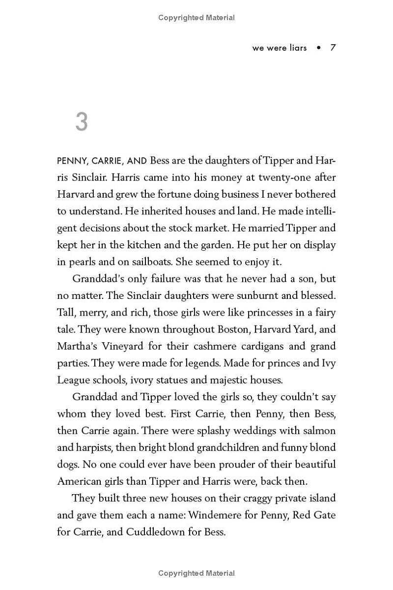 A beautiful and distinguished family. A private island. A brilliant, damaged girl; a passionate, political boy. A group of four friends—the Liars—whose friendship turns destructive. A revolution. An accident. A secret. Lies upon lies. True love. The truth.