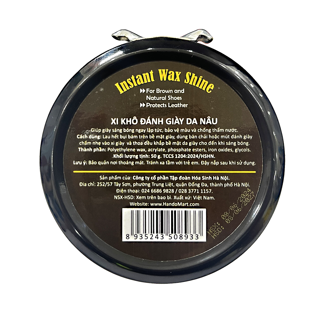 THÔNG TIN SẢN PHẨM Tên SP: Xi khô đánh giày da, đồ da Hando 50g (Đen / Nâu) Thành Phần : Polyethylene wax , acrylate, polysorbate esters , iron oxides , glycols Trọng lượng : 50g