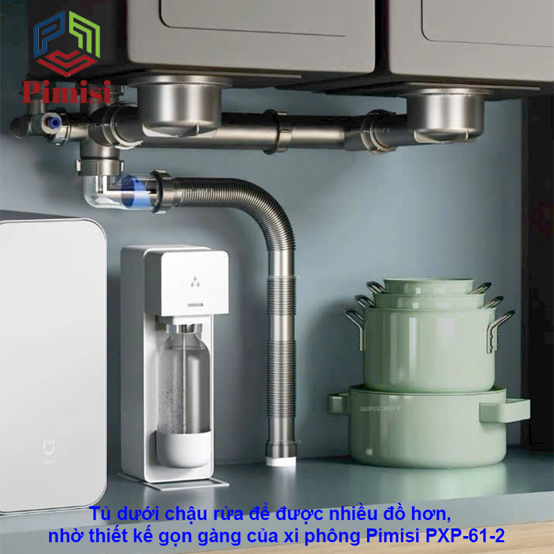 2. Thiết Kế Tinh Gọn – Tối Ưu Hóa Không Gian Tủ Bếp: Hiểu được tầm quan trọng của không gian trong căn bếp hiện đại, Pimisi đã thiết kế xi phông thoát nước chậu rửa bát PXP-61-2 với kiểu dáng tối giản, các chi tiết được bố trí khoa học, giúp tiết kiệm tối đa diện tích bên dưới bồn rửa chén 2 hố. Giờ đây, bạn có thể tận dụng không gian này để sắp xếp các vật dụng nhà bếp một cách gọn gàng và tiện lợi.