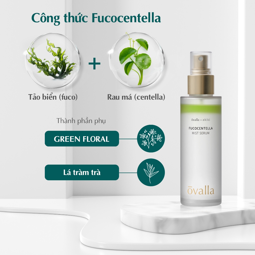 - Xịt khoáng Ovalla là sự kết hợp của Fucocentella mang lại hiệu quả làm dịu da, tạo độ ẩm và đàn hồi trước và cả sau khi trang điểm.