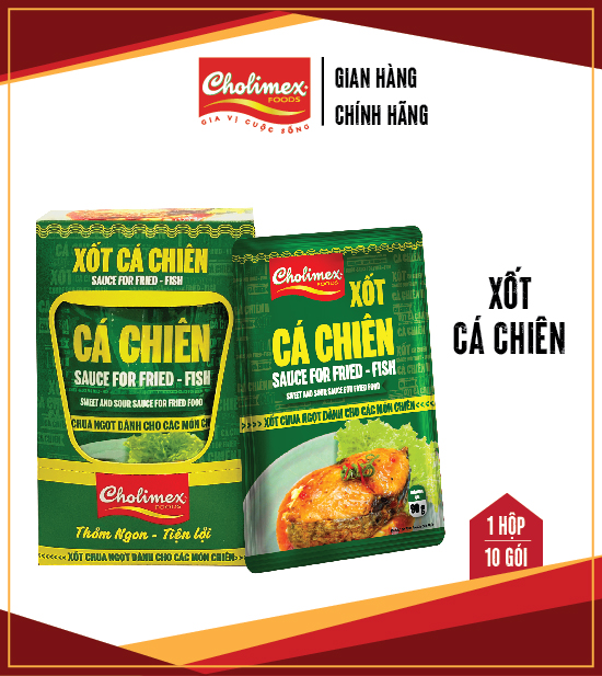 - Thời hạn sử dụng: 12 tháng kể từ ngày sản xuất in trên bao bì. • Xốt cá chiên Cholimex là sản phẩm tiện lợi không mất thời gian chế biến nước xốt rưới lên các món cá chiên vì tổng hợp đủ các gia vị ớt, tỏi, thơm, củ hành, đường, muối ăn, dầu ăn, dấm. • Được sản xuất theo công nghệ hiện đại, mọi khâu từ tuyển chọn nguyên liệu đến chế biến đóng chai đều diễn ra khép kín dưới sự giám sát và kiểm tra nghiêm ngặt. • Sản phẩm không chứa hoá chất, chất bảo quản độc hại, đảm bảo an toàn cho sức khoẻ người tiêu dùng. • Sau khi chiên cá chín vàng, cho trực tiếp xốt lên cá, dùng nóng.