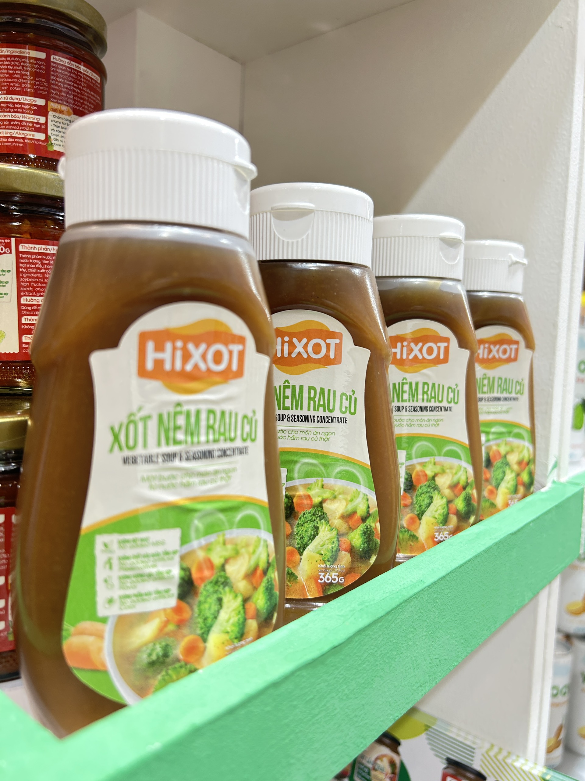 Mua tại TiktokXỐT NÊM RAU CỦ HiXOT CHAI 365Gram Một Bước Cho Món Ăn Ngon Từ Nước Hầm Rau Củ Thật Thành phần: Nước hầm rau củ 47% (củ cải, cà rốt, su su, mướp, bắp), muối, đường mía, dầu nành, chiết xuất nấm men, hành tím, đường ngô, tỏi, tinh bột khoai tây, tiêu. Hướng dẫn sử dụng: Dùng để nêm nếm các món ăn: xào, món canh, lẩu… Khẩu phần ăn tham khảo: 25g hoặc 2-3 muỗng canh cho 1 lít nước dùng Nêm nếm tùy theo khẩu vị Thông tin cảnh báo: Không sử dụng sản phẩm đã hết hạn sử dụng Thông tin dị ứng: Sản phẩm có chứa đậu nành. Ngày sản xuất và Hạn sử dụng: Xem trên bao bì sản phẩm