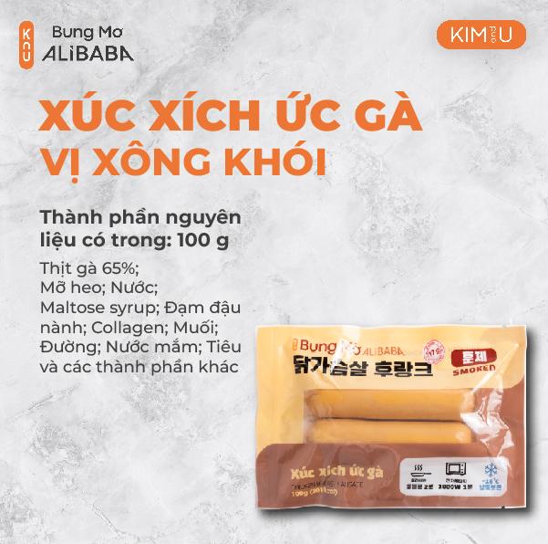 Thành phần: Thịt gà 65%; Mỡ heo; Nước;; Maltose syrup; Đạm đậu nành; Collagen; Muối; Đường; Nước mắm; Tiêu và các thành phần khác