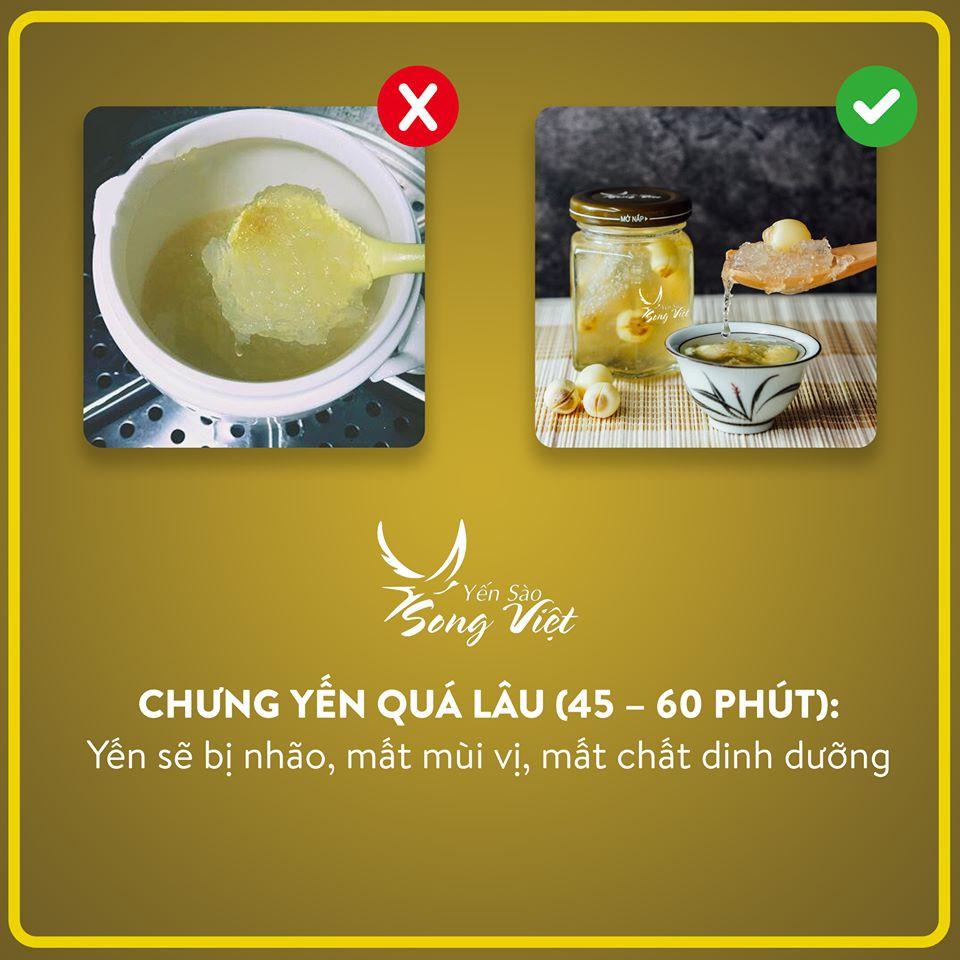 4. Chưng cách thủy 30 phút là dùng được HƯỚNG DẪN BẢO QUẢN YẾN SAU KHI CHƯNG Thời hạn bảo quản trong ngăn mát tủ lạnh (7-15 độ C) là 7 ngày Thời hạn bảo quản ở nhiệt độ thường là 24 tiếng LIỀU LƯỢNG VÀ CÁCH DÙNG Một người bình thường chỉ nên ăn một phần yến mỗi ngày (1,5 g yến khô, tương đương với 80 ml yến chưng) Trẻ em dưới 12 tuổi, phụ nữ có thai và cho con bú, người đang điều trị bệnh nên tham khảo ý kiến bác sỹ hoặc chuyên gia dinh dưỡng trước khi sử dụng Dùng đều đặn mỗi ngày và dùng vào một khung giờ nhất định để đạt hiệu quả tốt nhất Thời điểm dùng yến tốt nhất là sáng sớm sau khi ngủ dậy hoặc 1 tiếng trước khi đi ngủ ĐIỀU GÌ KHIẾN YẾN SÀO SONG VIỆT TRỞ NÊN KHÁC BIỆT? Không bán yến tổ, chỉ bán yến tinh chế chia theo khẩu phần, mỗi khẩu phần 1,5 g yến khô: xây dựng thói quen ăn đều ăn đủ, ăn theo khoa học, tránh bị thừa đạm do ăn quá nhiều yến và gây lãng phí do cơ thể không hấp thu được hết chất dinh dưỡng; Yến nguyên chất 100%, không chất bảo quản, không chất phụ gia, không chất tăng trọng, không trộn lẫn bất kỳ tạp chất nào khác; Tùy chọn đường phèn hoặc đường ăn kiêng: giúp kiểm soát lượng đường dung nạp vào cơ thể phù hợp với thể trạng và bệnh lý của mỗi người; Quy trình khai thác yến, sản xuất, đóng gói, phân phối đến tay người tiêu dùng là một quy trình hoàn toàn khép kín, do chúng tôi kiểm soát 100%, không có sự can thiệp của bất kỳ bên trung gian nào. VÌ SAO PHẢI CHIA YẾN THÀNH KHẨU PHẦN? Giúp kiểm soát hàm lượng yến ăn mỗi ngày đều nhau Khách hàng không phải bẻ gãy yến làm yến bị vụn, nát, hàm lượng không chính xác, ngày ăn nhiều, ngày ăn ít; không đảm bảo an toàn VSATTP Giúp nâng cao nhận thức của khách hàng về việc ăn đều ăn đủ
