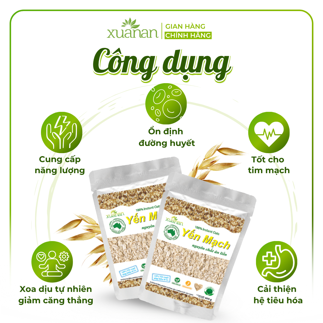 YẾN MẠCH NGUYÊN CHẤT ĂN LIỀN – TÚI 400G Yến mạch là loại ngũ cốc giàu chất xơ, giàu đạm, vitamin và dưỡng chất tự nhiên. Yến mạch nguyên chất Xuân An (Instant Oats) 100% được nhập khẩu từ ÚC. Thành phần : 100% Yến mạch nguyên chất nhập khẩu từ Úc. Không chất bảo quản, không hương liệu, không phụ gia. Sử dụng Yến mạch hằng ngày giúp giảm nguy cơ tim mạch, tiểu đường, giảm lượng cholesterol trong máu. Phòng tránh bệnh loãng xương, ung thư, béo phì, táo bón. Giúp tăng khả năng tập trung, tránh suy nhược thần kinh, cũng cố hệ miễn dịch. Yến mạch có khả năng chống viêm và làm lành các vết thương trên da. Mặt nạ yến mạch làm sạch da và mịn da, dưỡng chất saponin giúp chống lão hóa hiệu quả. Đối tượng sử dụng : Thích hợp với mọi lứa tuổi. Tốt cho người ăn kiêng, tiểu đường, béo phì và táo bón. Quy cách đóng gói: 400g/túi – 24 túi/thùng Hướng dẫn sử dụng: Dùng ăn liền hoặc làm nguyên liệu chế biến bữa ăn trong gia đình. Pha 30 g yến mạch nguyên chất với 180 ml nước thật sôi, khuấy đều trước khi dùng, có thể thêm đường, sữa  (sữa bột, sữa tươi), hoặc trái cây tuỳ theo sở thích. Dùng nấu cháo: đun sôi khoảng 250 ml nước (cho một ít thịt, tôm, cá, hoặc lươn), nêm gia vị sau đó cho 50g yến mạch đun tiếp trong 3 phút rồi ăn. Bảo quản: Bảo quản nơi khô ráo, thoáng mát; tránh tiếp xúc trực tiếp với không khí và ánh nắng mặt trời. Thông tin cảnh báo: Không dùng khi sản phẩm bị rách, mốc hoặc đã hết hạn sử dụng. Sản phẩm của: Công ty TNHH Thực Phẩm Dinh Dưỡng Xuân An.