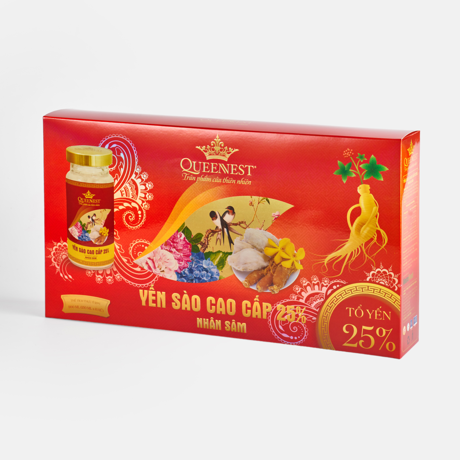 YẾN SÀO CAO CẤP QUEENNEST 25% - 150ML (Hộp 6 Hũ x 150ml) Thành phần: Nước (64.7%), tổ yến thiên nhiên (25%), đường phèn (10%), ngân nhĩ, hương yến tổng hợp, chất ổn định (E331),