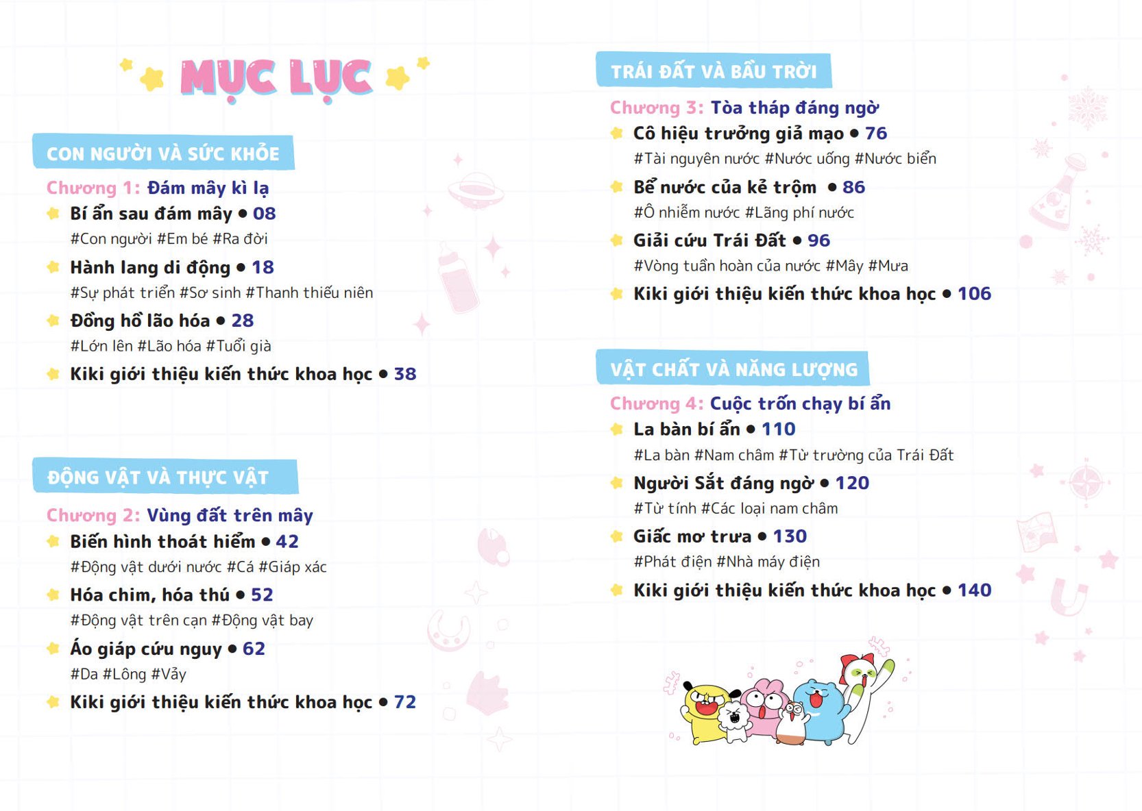 Mua tại TiktokNhóm Zookiz quy tụ những bạn nhỏ tinh nghịch mà đáng yêu: thỏ Kiki láu lỉnh, gấu Bongbong ham ăn, “hổ chó” Alex hay càu nhàu, chuột cảnh Ppuyo ngốc nghếch, lười Nana điệu đà, chó xù Pang ham vui. Theo chân Zookiz, các độc giả nhỏ sẽ bước vào những cuộc phiêu lưu kì thú và hài hước tại trường khoa học bí ẩn đồng thời học thêm nhiều kiến thức bổ ích.